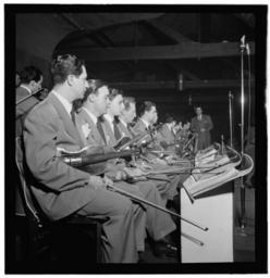 | Keywords: (Portrait of Bill Cogliano, Joseph Kowalewski, Carl Ottobrino, Stanley Kraft, Dick Motzlinski, Manny Thaler, Sol Libero, Mack Pierce, Stanley M. Aronson, Vincent Carbone, and Tex Beneke, New York, N.Y., ca. June 1947) (LOC) (5189339287).jpg Gottlieb William P 1917- photographer Portrait of Bill Cogliano Joseph Kowalewski Carl Ottobrino Stanley Kraft Dick Motzlinski Manny Thaler Sol Libero Mack Pierce Stanley M Aronson Vincent Carbone and Tex Beneke New York N Y ca June 1947 1 negative b w ; 2 1/4 x 2 1/4 in Caption from Down Beat Here's the front line of the Glenn Miller orchestra conducted by Tex Beneke What a payroll There are only 10 men here but there are 20 more plus a vocal group in back of them Left to right Bill Cogliano Joseph Kowalewski Carl Ottobrino Stanley Kraft Dick Motzlinski Manny Thaler Sol Libero Mack Pierce Stanley Aronson Vincent Carbone and Tex Notes Gottlieb Collection Assignment No 026 Purchase William P Gottlieb Forms part of William P Gottlieb Collection Library of Congress In Beneke band Down Beat v 14 no 13 June 18 1947 p 12 Subjects Cogliano Bill Kowalewski Joseph Ottobrino Carl Kraft Stanley Motzlinski Dick Thaler Manny Libero Sol Pierce Mack Aronson Stanley M 1922- Carbone Vincent Beneke Tex Glenn Miller Orchestra Jazz musicians--1940-1950 Big bands--1940-1950 Saxophonists--1940-1950 Violinists--1940-1950 Format Portrait photographs--1940-1950 Cityscape photographs--1940-1950 Film negatives--1940-1950 Rights Info Mr Gottlieb has dedicated these works to the public domain but rights of privacy and publicity may apply http //lcweb2 loc gov/diglib/ihas/html/gottlieb/gottlieb-copyright html lcweb2 loc gov/diglib/ihas/html/gottlieb/gottlieb-copyrig Repository negative Library of Congress Prints Photographs Division Washington D C 20540 USA http //hdl loc gov/loc pnp/pp print hdl loc gov/loc pnp/pp print Part Of William P Gottlieb Collection DLC 99-401005 General information about the Gottlieb Collection is available at http //lcweb2 loc gov/diglib/ihas/html/gottlieb/gottlieb-home html lcweb2 loc gov/diglib/ihas/html/gottlieb/gottlieb-home html Persistent URL http //hdl loc gov/loc music/gottlieb 09771 hdl loc gov/loc music/gottlieb 09771 Call Number LC-GLB23- 0977<br/> PD-Gottlieb https //www flickr com/photos/library_of_congress/5189339287/ Portrait of Bill Cogliano Joseph Kowalewski Carl Ottobrino Stanley Kraft Dick Motzlinski Manny Thaler Sol Libero Mack Pierce Stanley M Aronson Vincent Carbone and Tex Beneke New York N Y ca June 1947 LOC https //www flickr com/people/8623220 N02 The Library of Congress http //www loc gov/rr/print/195_copr html noknown The Library of Congress Flickr Commons Flickr-no known copyright restrictions The Library of Congress https //flickr com/photos/8623220 N02/5189339287 2015-09-01 22 58 10 pd Photographs by William P Gottlieb |