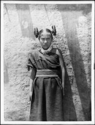 | Keywords: Portrait of a Hopi maiden, Arizona, ca.1898 (CHS-4622).jpg en <br> Portrait of a Hopi maiden Arizona ca 1898 Photographic portrait of a Hopi maiden ca 1898 She wears a dress with only one shoulder and necklaces Her hair is parted in the middle into flat buns at the sides of her head Her arms rest against her side She stands in front of an adobe wall Call number CHS-4622 Photographer James George Wharton Filename CHS-4622 Coverage date 1898 Part of collection California Historical Society Collection 1860-1960 Format glass plate negatives Type images Part of subcollection Title Insurance and Trust and C C Pierce Photography Collection 1860-1960 Repository name USC Libraries Special Collections Accession number 4622 Microfiche number 1-168- Archival file chs_Volume97/CHS-4622 tiff Repository address Doheny Memorial Library Los Angeles CA 90089-0189 Geographic subject country USA Format aacr2 2 photographs glass photonegative photoprint b w ; 22 x 17 cm Rights Digitally reproduced by the USC Digital Library; From the California Historical Society Collection at the University of Southern California Subject adlf tribal areas Project USC Repository email specol usc edu Identifying number unidentified no James-169 Contributing entity California Historical Society Date created 1898 Publisher of the digital version University of Southern California Libraries Format aat photographic prints; photographs Geographic subject state Arizona Legacy record ID chs-m16948; USC-1-1-1-13518 Access conditions Send requests to address or e-mail given Phone 213 821-2366; fax 213 740-2343 Subject file heading Indians -- Hopi Subject lcsh Indians of North America; Hopi Indians; Women Subject Hopi Indians 1898 date created George Wharton James 1858 1923 http //digitallibrary usc edu/cdm/ref/collection/p15799coll65/id/16868 PD-old-70-1923 Images from USC Digital Library uploaded by Fæ Photographs by George Wharton James California Historical Society Collection 1860-1960 Glass plate negatives Hopi women |