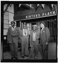 | Keywords: (Portrait of Thelonious Monk, Howard McGhee, Roy Eldridge, and Teddy Hill, Minton's Playhouse, New York, N.Y., ca. Sept. 1947) (LOC) (4843753254).jpg Gottlieb William P 1917- photographer Portrait of Thelonious Monk Howard McGhee Roy Eldridge and Teddy Hill Minton's Playhouse New York N Y ca Sept 1947 1 negative b w ; 2 1/4 x 2 1/4 in Caption from Down Beat In front of Minton's left to right Thelonius Monk Howard McGhee Roy Eldridge and Teddy Hill Notes Gottlieb Collection Assignment No 231 Reference print available in Music Division Library of Congress Purchase William P Gottlieb Forms part of William P Gottlieb Collection Library of Congress In Thelonius Monk--genius of bop Down Beat v 14 no 20 Sept 24 1947 p 2 Subjects Monk Thelonious McGhee Howard 1918- Eldridge Roy 1911- Hill Teddy 1909-1978 Jazz musicians--1940-1950 Pianists--1940-1950 Composers--1940-1950 Trumpet players--1940-1950 Saxophonists--1940-1950 Minton's Playhouse Format Portrait photographs--1940-1950 Group portraits--1940-1950 Film negatives--1940-1950 Rights Info Mr Gottlieb has dedicated these works to the public domain but rights of privacy and publicity may apply http //lcweb2 loc gov/diglib/ihas/html/gottlieb/gottlieb-copyright html lcweb2 loc gov/diglib/ihas/html/gottlieb/gottlieb-copyrig Repository negative Library of Congress Prints Photographs Division Washington D C 20540 USA http //hdl loc gov/loc pnp/pp print hdl loc gov/loc pnp/pp print reference print Library of Congress Music Division Washington D C 20540 USA http //loc gov/rr/perform/ loc gov/rr/perform/ Part Of William P Gottlieb Collection DLC 99-401005 General information about the Gottlieb Collection is available at http //lcweb2 loc gov/diglib/ihas/html/gottlieb/gottlieb-home html lcweb2 loc gov/diglib/ihas/html/gottlieb/gottlieb-home html Persistent URL http //hdl loc gov/loc music/gottlieb 06201 hdl loc gov/loc music/gottlieb 06201 Call Number LC-GLB23- 0620<br/> PD-Gottlieb https //www flickr com/photos/library_of_congress/4843753254/ Portrait of Thelonious Monk Howard McGhee Roy Eldridge and Teddy Hill Minton's Playhouse New York N Y ca Sept 1947 LOC https //www flickr com/people/8623220 N02 The Library of Congress http //www loc gov/rr/print/195_copr html noknown The Library of Congress Flickr Commons Flickr-no known copyright restrictions The Library of Congress https //flickr com/photos/8623220 N02/4843753254 2015-09-02 00 07 57 pd Photographs by William P Gottlieb |
