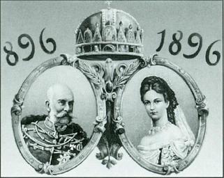 Keywords: Portrayal of Franz Joseph and his wife Elisabeth on a millennium memorial leaf with the crown.jpg author 1896 Országos Széchényi Könyvtár Budapest object history credit line accession number own scanned by Szilas from A magyar Szent Korona by Tóth Endre Szelényi Károly Kossuth 2000 Budapest PD-old-100 Holy Crown of Hungary in art Franz Joseph I of Austria in 1896 Empress Elisabeth of Austria in portraits