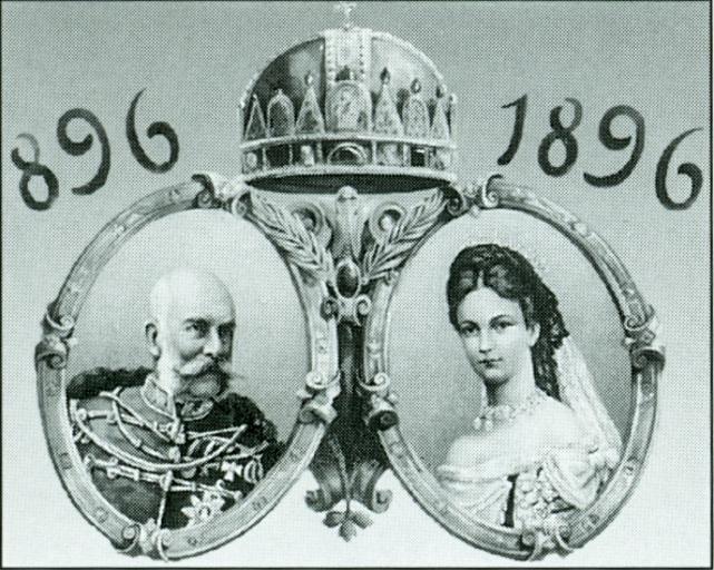View Original:Portrayal_of_Franz_Joseph_and_his_wife_Elisabeth_on_a_millennium_memorial_leaf_with_the_crown.jpg (593x474)