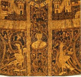 | Keywords: Portrayal of Saint Emeric of Hungary in the axis of the coronation pall.jpg author 1031 textile embroidery Institution Hungarian National Museum Budapest object history credit line accession number own scanned by Szilas from A magyar Szent Korona by Tóth Endre Szelényi Károly Kossuth 2000 Budapest PD-old-100 Coronation pall of Hungary | ||||