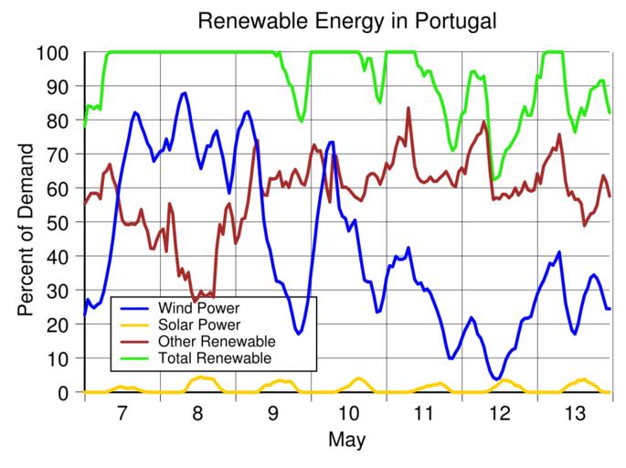 MAKE A MEME View Large Image Portugal renewable energy production May 7-13 2016.svg translate yes en For two days during the week of April 17-23 2016 all of the electricity used in Portugal was generated from renewable energy A peak of 122 of demand was produced from ...
