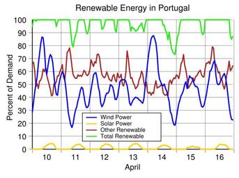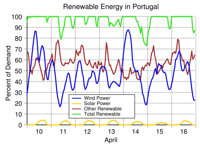 MAKE A MEME View Large Image Portugal renewable energy production April 10-16 2016.svg translate yes en For over half of the week of April 10-16 2016 all of the electricity used in Portugal was generated from renewable energy A peak of 149 of demand was produced from ...