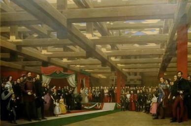 Keywords: Pose de la première pierre - Pont des chaînes Budapest.jpg en Laying the Foundation stone for Chain Bridge in 1842 Painted in 1864 by Barabás Miklós Exposed in Hungarian National Museum Budapest http //www hung-art hu/index-en html fr Pose de la première pierre Peint en 1864 par Barabás Miklós ce tableau montre la cérémonie qui marqua le début de la construction du pont des Chaînes à Budapest en 1842 Exposée au musée national hongrois Budapest hu A Lánchíd alapkőletétele 1842-ben Olaj vászon 275 x 397 cm Történelmi Képcsarnok Magyar Nemzeti Múzeum Budapest http //www hung-art hu/frames html /magyar/b/barabas/index html Yelkrokoyade creator Barabás Miklós 1864 other versions <gallery> File Barabas-lanchid jpg </gallery> PD-old-100 Chain Bridge Budapest in art 1864 paintings in Hungary Foundation stone laying ceremonies Paintings by Miklós Barabás in the Historical Picture Gallery Budapest 1842 in Buda Painted portraits of István Széchenyi Fashion in 1842 Nobility of Hungary 19th-century oil on canvas paintings in Hungary Wood constructions Green red white Díszmagyar Hungary in history paintings Pelisses Paintings by Miklós Barabás with fur 19th-century oil portraits of standing men at full length in ceremonial costumes Fur fashion in 1864 |