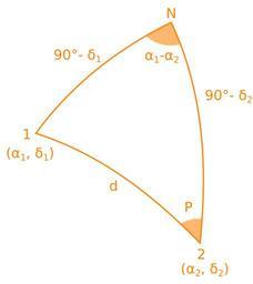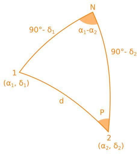 Keywords: Position Angle - Spherical Triangle for Derivation.svg en Diagram showing the spherical triangle used for deriving the formula for the astronomical position angle of point 1 with respect to point 2 The corners of the triangle are the north celestial pole N point 1 with celestial coordinates alpha1 and delta1 and point 2 with celestial coordinates alpha2 and delta2 The angle P at point 2 is the position angle of point 1 with respect to point 2 A formula for P can be derived applying spherical trigonometry to this triangle own Sch 2011-09-16 Cc-zero Astronomical diagrams