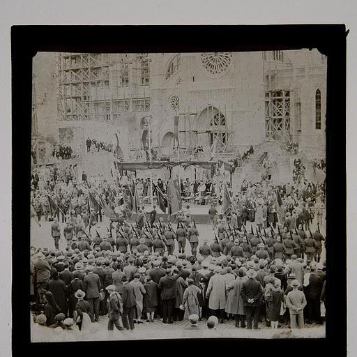 | Keywords: cathedral ypres ieper wwi war reconstruction world war one worldwarone vintage antique black and white blackandwhite b&w bw belgium whatsthatpicture ww1 topographical public domain publicdomain photo border black and white Thanks to ajw423uk this has been identified as Ypres cathedral. As suspected it is the south face, which means where they are standing, if I can work out the angle, is close to or even within the ruins of the subsequently re-built wing of the Cloth Hall. I am assuming that this is some sort of event shortly after WWI as the parade is obviously military, and especially given the fairly obvious damage. So what is it, and exactly when? Visit my vintage photo identification site at www.whatsthatpicture.com Thanks to ajw423uk this has been identified as Ypres cathedral. As suspected it is the south face, which means where they are standing, if I can work out the angle, is close to or even within the ruins of the subsequently re-built wing of the Cloth Hall. I am assuming that this is some sort of event shortly after WWI as the parade is obviously military, and especially given the fairly obvious damage. So what is it, and exactly when? Visit my vintage photo identification site at www.whatsthatpicture.com |