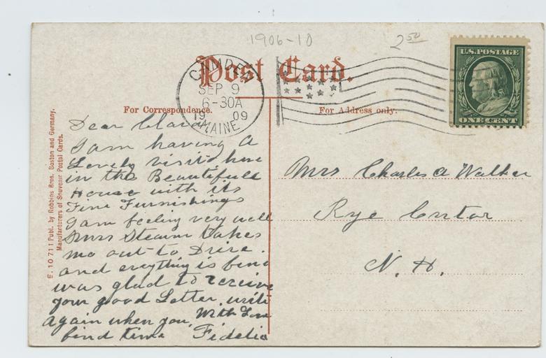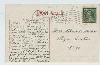 Keywords: postcards correspondence fidelia clara walker clarawalker charles walker charleswalker camden rye center nh ryecenternh text document writing drawing sketch Postmarked Camden, September 9, 1909. Dear Clara, I am having a lovely visit here in this beautiful house with its fine furnishings. I am feeling very well. [? Stearn?] takes me out to drive and everything is fine. Was glad to receive your good letter. Write again when you find time. With love, Fidelia Addressed to: Mrs. Charles A. Walker Rye Center N.H. Postmarked Camden, September 9, 1909. Dear Clara, I am having a lovely visit here in this beautiful house with its fine furnishings. I am feeling very well. [? Stearn?] takes me out to drive and everything is fine. Was glad to receive your good letter. Write again when you find time. With love, Fidelia Addressed to: Mrs. Charles A. Walker Rye Center N.H. |