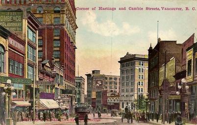 | Keywords: architecture outdoor skyline building city "Corner of Hastings and Cambie Streets, Vancouver, B. C. 4027 Copyright Canada, 1912, by R. Broadbridge" Post card. Empire Series. Pacific Publishing Co., Vancouver, B.C. View looking east from the 300-block of West Hastings Street towards the intersection at Cambie Street in Vancouver, BC. "Corner of Hastings and Cambie Streets, Vancouver, B. C. 4027 Copyright Canada, 1912, by R. Broadbridge" Post card. Empire Series. Pacific Publishing Co., Vancouver, B.C. View looking east from the 300-block of West Hastings Street towards the intersection at Cambie Street in Vancouver, BC. |