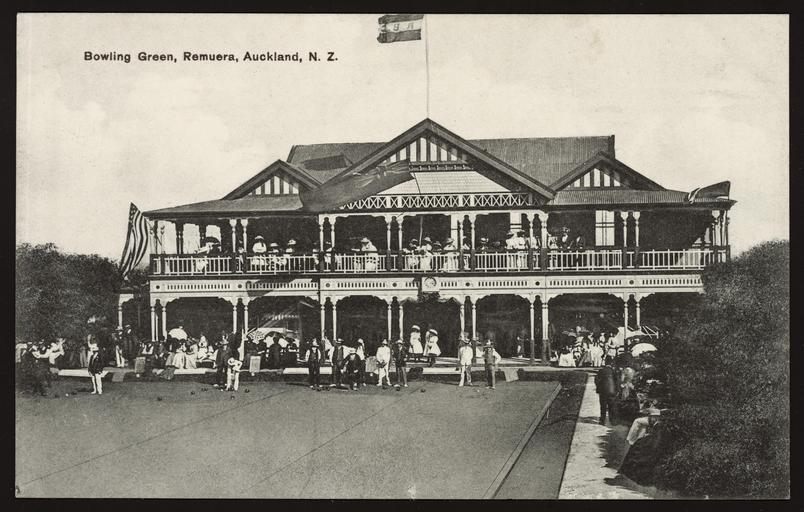 | Keywords: photo border monochrome architecture Postcard shows a general view of the bowling green and clubhouse at the Remuera Bowling Club, with its "RBC" flag flying from a pole on the roof. The card was sent to Miss M Stephens, care of C M Banks on Thorndon Quay, [Wellington] City. The writer, Jack, was one of a team which had lost a championship to Johnsonville 4-2 the previous Saturday. Because of the address ("City"), it appears he was writing from Wellington. Quantity: 1 b&w photo-mechanical print(s) on postcard.. Physical Description: Photolithograph 89 x 140 mm. Fergusson Ltd. [Postcard]. Bowling Green, Remuera, Auckland, N.Z. Dominion of New Zealand post card (carte postale). Gold medal series, Fergusson Limited, [No.] 111. Printed in Germany. 186986 [ca 1907-1914]. [Postcard album of cards collected by May Stephens. ca 1905-1915].. Ref: Eph-B-POSTCARD-Vol-1-031-2. Alexander Turnbull Library, Wellington, New Zealand. natlib.govt.nz/records/23237709 Postcard shows a general view of the bowling green and clubhouse at the Remuera Bowling Club, with its "RBC" flag flying from a pole on the roof. The card was sent to Miss M Stephens, care of C M Banks on Thorndon Quay, [Wellington] City. The writer, Jack, was one of a team which had lost a championship to Johnsonville 4-2 the previous Saturday. Because of the address ("City"), it appears he was writing from Wellington. Quantity: 1 b&w photo-mechanical print(s) on postcard.. Physical Description: Photolithograph 89 x 140 mm. Fergusson Ltd. [Postcard]. Bowling Green, Remuera, Auckland, N.Z. Dominion of New Zealand post card (carte postale). Gold medal series, Fergusson Limited, [No.] 111. Printed in Germany. 186986 [ca 1907-1914]. [Postcard album of cards collected by May Stephens. ca 1905-1915].. Ref: Eph-B-POSTCARD-Vol-1-031-2. Alexander Turnbull Library, Wellington, New Zealand. natlib.govt.nz/records/23237709 |