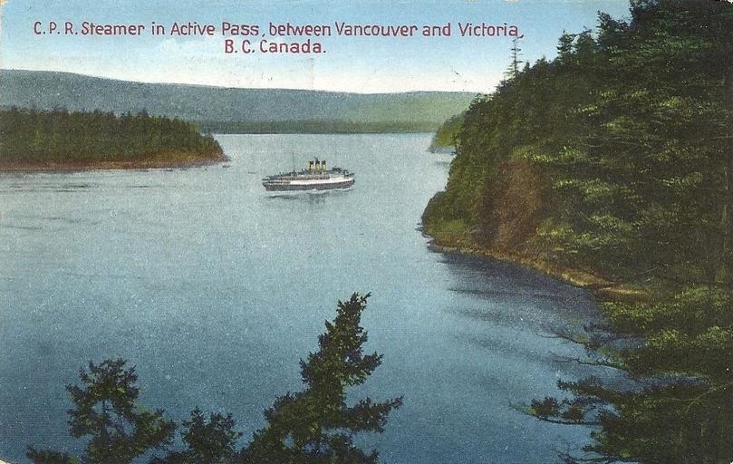 Keywords: outdoor watercourse water "C. P. R. Steamer in Active Pass, between Vancouver and Victoria, B. C. Canada." Post Card. Published by the Coast Publishing Company, Vancouver, B.C. Imprimé en Allemagne. View looking west through Active Pass from Galiano Island, BC. "C. P. R. Steamer in Active Pass, between Vancouver and Victoria, B. C. Canada." Post Card. Published by the Coast Publishing Company, Vancouver, B.C. Imprimé en Allemagne. View looking west through Active Pass from Galiano Island, BC. |