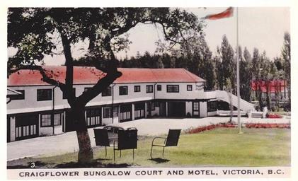 Keywords: outdoor "Craigflower Bungalow Court and Motel, Victoria, B.C." Made in Canada by the Gowen, Sutton Co., Ltd., Vancouver, B.C. Craigflower Auto Court, 110 (Old) Island Highway (Hwy. 1; Later Hwy. 1A), View Royal, BC. Built in the 1940s on the site of today's Craigflower Manor parking lot off Admirals Road at the south end of the Craigflower Bridge. Operated in conjunction with the Craigflower Bungalow Court at the NE corner of Admirals and Craigflower Roads in Esquimalt, BC. Renamed the Discovery Motel (1962-67) until demolition. View looking NE. The Craigflower Bungalow Court can be seen in the distance on the right, across Admirals Road. "Craigflower Bungalow Court and Motel, Victoria, B.C." Made in Canada by the Gowen, Sutton Co., Ltd., Vancouver, B.C. Craigflower Auto Court, 110 (Old) Island Highway (Hwy. 1; Later Hwy. 1A), View Royal, BC. Built in the 1940s on the site of today's Craigflower Manor parking lot off Admirals Road at the south end of the Craigflower Bridge. Operated in conjunction with the Craigflower Bungalow Court at the NE corner of Admirals and Craigflower Roads in Esquimalt, BC. Renamed the Discovery Motel (1962-67) until demolition. View looking NE. The Craigflower Bungalow Court can be seen in the distance on the right, across Admirals Road. |