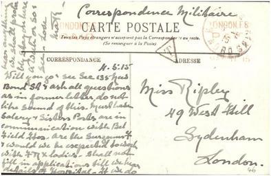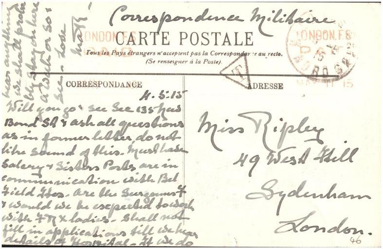 Keywords: postcard ww1 world war 1 worldwar1 france 1915 ripley public domain publicdomain nurse ripley nurseripley text document writing monochrome Sent by a nurse, Margaret Ripley, to her sister back in England. As far as I can tell (corrections and additions welcome) this reads: "4.5.15 Will you go and see [???] 135 New Bond St & ask all questions as in former letter, do not like sound of this. Must have salery & Sisters Posts[?] are in communication with Bel[gian?] Field Hos[pital]. Are the surgeons F[rench?] & would we be expected to work with FRX [French Red Cross] ladies. Shall not fill in applications til we hear details of Hospital. If we do hear anything we shall probably stay on here a week or so & see. Love Mar" For more details of the story behind this album see www.flickr.com/photos/whatsthatpicture/sets/7215762769463... Sent by a nurse, Margaret Ripley, to her sister back in England. As far as I can tell (corrections and additions welcome) this reads: "4.5.15 Will you go and see [???] 135 New Bond St & ask all questions as in former letter, do not like sound of this. Must have salery & Sisters Posts[?] are in communication with Bel[gian?] Field Hos[pital]. Are the surgeons F[rench?] & would we be expected to work with FRX [French Red Cross] ladies. Shall not fill in applications til we hear details of Hospital. If we do hear anything we shall probably stay on here a week or so & see. Love Mar" For more details of the story behind this album see www.flickr.com/photos/whatsthatpicture/sets/7215762769463... |