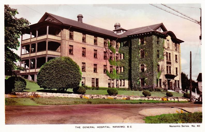 | Keywords: building architecture outdoor "The General Hospital, Nanaimo, B. C. Nanaimo Series No. 40" Post Card. This is a Real Photograph. Hand Coloured. Copyright, J. Fred Spalding. Published by The Camera Products Co., 1731, Dunbar Street, Vancouver, B.C. Made in England. Nanaimo Hospital, Miss F. H. Archer, Superintendent, W. McGirr, Secretary. Phone 5. [1940] 375 Kennedy Street (W corner at Franklyn Street), Nanaimo, BC on Vancouver Island. Built 1925; extant. Now Chartwell Malaspina Gardens Care Residence, 388 Machleary Street. "The General Hospital, Nanaimo, B. C. Nanaimo Series No. 40" Post Card. This is a Real Photograph. Hand Coloured. Copyright, J. Fred Spalding. Published by The Camera Products Co., 1731, Dunbar Street, Vancouver, B.C. Made in England. Nanaimo Hospital, Miss F. H. Archer, Superintendent, W. McGirr, Secretary. Phone 5. [1940] 375 Kennedy Street (W corner at Franklyn Street), Nanaimo, BC on Vancouver Island. Built 1925; extant. Now Chartwell Malaspina Gardens Care Residence, 388 Machleary Street. |