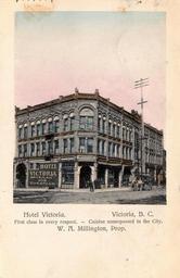 Keywords: text "Hotel Victoria, Victoria, B. C. First class in every respect. — Cuisine unsurpassed in the City. W. A. Millington, Prop." Post Card. Hotel Victoria, 140 (later 1406) Government Street, Victoria, BC Wolfenden & Millington, proprietors [1905]. NW corner of Government and Johnson Streets in Victoria, BC on Vancouver Island. "Hotel Victoria, Victoria, B. C. First class in every respect. — Cuisine unsurpassed in the City. W. A. Millington, Prop." Post Card. Hotel Victoria, 140 (later 1406) Government Street, Victoria, BC Wolfenden & Millington, proprietors [1905]. NW corner of Government and Johnson Streets in Victoria, BC on Vancouver Island.
