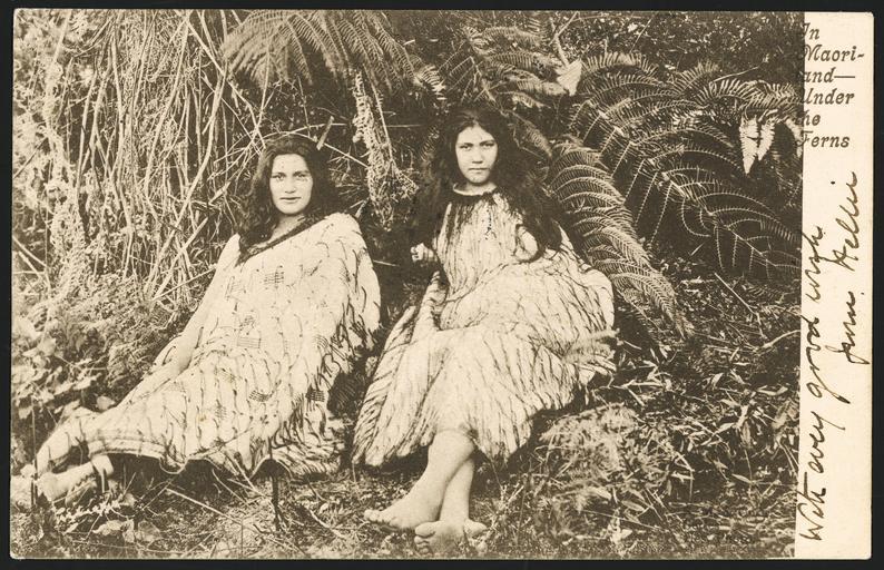 Keywords: photo border outdoor monochrome Postcard shows a photograph of two young Maori women wearing traditional tag cloaks, seated on the ground under a bank of ferns. At the far right is a handwritten message "With every good wish, from Nellie. The card is addressed to Miss Lottie Har[...?], Post Office, Leith Valley, and is date stamped 1904. Quantity: 1 b&w photo-mechanical print(s) on postcard.. Physical Description: Photolithograph on postcard, 91 x 141 mm. Provenance: Part of the McCarthy Collection of greeting cards. [Postcard]. In Maoriland - Under the ferns. Post card - carte postale [1904]. Various artists :[Postcards and greeting cards collected by McCarthy. 1880s-1940s?]. Ref: Eph-A-CARDS-McCarthy-010. Alexander Turnbull Library, Wellington, New Zealand. natlib.govt.nz/records/23157832 Postcard shows a photograph of two young Maori women wearing traditional tag cloaks, seated on the ground under a bank of ferns. At the far right is a handwritten message "With every good wish, from Nellie. The card is addressed to Miss Lottie Har[...?], Post Office, Leith Valley, and is date stamped 1904. Quantity: 1 b&w photo-mechanical print(s) on postcard.. Physical Description: Photolithograph on postcard, 91 x 141 mm. Provenance: Part of the McCarthy Collection of greeting cards. [Postcard]. In Maoriland - Under the ferns. Post card - carte postale [1904]. Various artists :[Postcards and greeting cards collected by McCarthy. 1880s-1940s?]. Ref: Eph-A-CARDS-McCarthy-010. Alexander Turnbull Library, Wellington, New Zealand. natlib.govt.nz/records/23157832 |