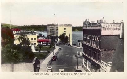 | Keywords: outdoor "Church and Front Streets, Nanaimo, B.C." Postcard. Made in Canada by The Gowen, Sutton Co. Ltd., Vancouver, B. C. View looking NE up the 000-block of Church Street towards the intersection at Front Street in Nanaimo, BC on Vancouver Island. "Church and Front Streets, Nanaimo, B.C." Postcard. Made in Canada by The Gowen, Sutton Co. Ltd., Vancouver, B. C. View looking NE up the 000-block of Church Street towards the intersection at Front Street in Nanaimo, BC on Vancouver Island. |