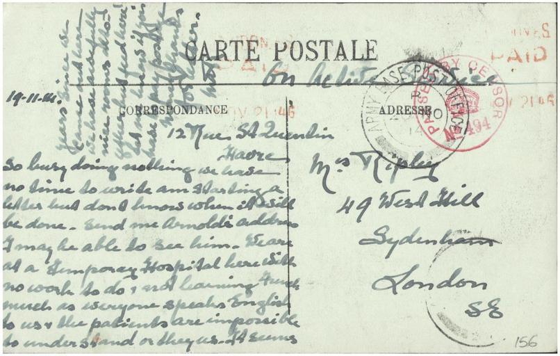 | Keywords: postcard ripley sydenham public domain publicdomain ww1 nurse ripley nurseripley document text writing drawing sketch This is the first postcard in the album that was sent from Margaret Ripley to her mother.  It was sent from Le Havre and is clearly marked "On Active Service".  From what I can work out (corrections welcome), it reads: "12 Rue St Quentin, Havre So busy doing nothing we have no time to write am starting a letter but don't know when it will be done. Send me Arnold's address I may be able to see him.  We are at a Temporary Hospital here with no work to do and learning French as much as everyone speaks English to us & the patients are impossible to understand or they us. It seems years since we came out here. We have awfully nice rooms altogether but feed here! Let me know if you have to pay postage. Many thanks for letter.  Mar" This is the first postcard in the album that was sent from Margaret Ripley to her mother.  It was sent from Le Havre and is clearly marked "On Active Service".  From what I can work out (corrections welcome), it reads: "12 Rue St Quentin, Havre So busy doing nothing we have no time to write am starting a letter but don't know when it will be done. Send me Arnold's address I may be able to see him.  We are at a Temporary Hospital here with no work to do and learning French as much as everyone speaks English to us & the patients are impossible to understand or they us. It seems years since we came out here. We have awfully nice rooms altogether but feed here! Let me know if you have to pay postage. Many thanks for letter.  Mar" |