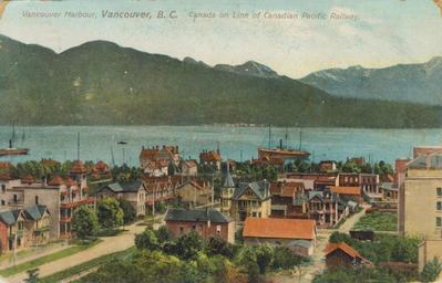 | Keywords: outdoor "Vancouver Harbour, Vancouver, B. C. Canada on Line of Canadian Pacific Railway." Published by The Stedman Brothers, Brantford, Ontario. NW view toward the intersection of Howe and Dunsmuir Streets and Burrard Inlet from the old CPR Hotel Vancouver in Vancouver, BC. "Vancouver Harbour, Vancouver, B. C. Canada on Line of Canadian Pacific Railway." Published by The Stedman Brothers, Brantford, Ontario. NW view toward the intersection of Howe and Dunsmuir Streets and Burrard Inlet from the old CPR Hotel Vancouver in Vancouver, BC. |