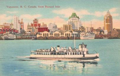 | Keywords: outdoor vehicle boat waterfront water "Vancouver, B. C., Canada, from Burrard Inlet" West Vancouver Ferry No. 6 passes CPR Pier B-C on its way to Ambleside in west Vancouver, BC. "The West Vancouver service, started in 1909 by real-estate promoter John Lawson, was operated by West Vancouver municipality after 1912. The opening of Lions' Gate bridge in 1938 sealed its fate, although the service continued through the war years until February 10, 1946." [From: Vancouver: The Way It Was by Michael Kluckner (Whitecap Books Ltd., 1984)] "Vancouver, B. C., Canada, from Burrard Inlet" West Vancouver Ferry No. 6 passes CPR Pier B-C on its way to Ambleside in west Vancouver, BC. "The West Vancouver service, started in 1909 by real-estate promoter John Lawson, was operated by West Vancouver municipality after 1912. The opening of Lions' Gate bridge in 1938 sealed its fate, although the service continued through the war years until February 10, 1946." [From: Vancouver: The Way It Was by Michael Kluckner (Whitecap Books Ltd., 1984)] |