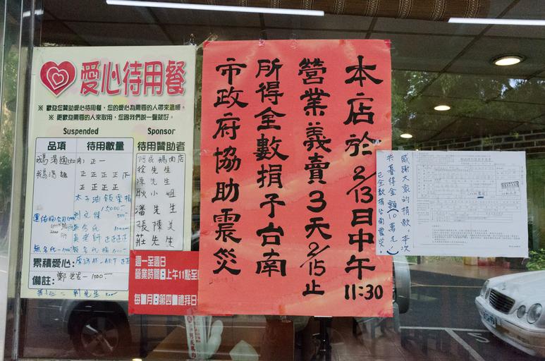 | View Original: | Poster of Thanking Charity Sell for 2016 Kaohsiung Earthquake Relief Effort on Window of A-Chen Geese Restaurant 20160530.jpg (4928x3264) | |||