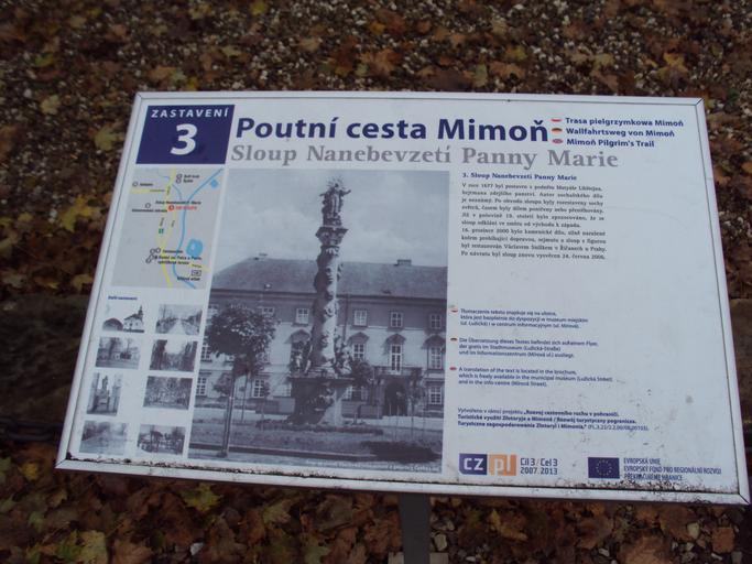 Keywords: Poutní 3.jpg cs Cedule u označení památky v Mimoni own Zákupák 2010-10-16 Poutní cesta Mimoň Virgin Mary Assumption column in Mimoň