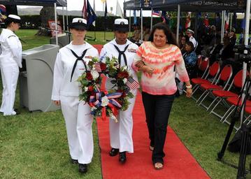 | Keywords: POW-MIA service 130920-N-HJ915-174.jpg en Petty Officer 1st Class Tara Jones left and Petty Officer 1st Class Patricia Moore escort Barbara Denton-Brownell the daughter of missing in action Hospital Corpsman 3rd Class Manuel Reyes Denton to place a wreath at the Naval Hospital Camp Pendleton Prisoner of War/Missing in Action memorial during a service of remembrance on National POW/MIA Recognition Day 2013-09-20 POW/MIA https //www dvidshub net/image/1025969 130920-N-HJ915-174 2013-09-25 20 07 CAMP PENDLETON CA US PD-USGov-Military-Navy Marine Corps Base Camp Pendleton National POW/MIA Recognition Day Images from DoD uploaded by Fæ |