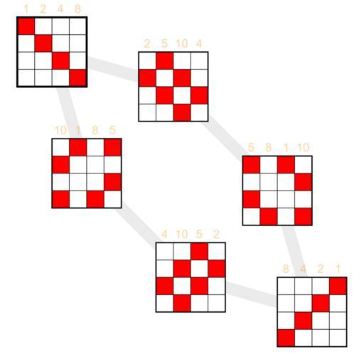 Keywords: Powers of wp( 2, 5,10, 4).svg Cycle graph of compression matrices of 4-bit Walsh permutations related to 4-ary bent functions own 2012 User Lipedia 4-bit Walsh permutations related to bent functions; powers in C6 cycle graphs