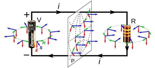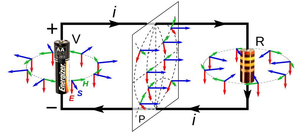 | Keywords: Poynting vectors of DC circuit.svg  resistor R showing the Poynting vectors <span style color blue; >S blue</span> region in the space surrounding it as well as the fields it is derived from the electric field <span style color red; >E red</span> region and the magnetic field <span style color green; >H green</span> region P   E x H The Poynting vector represents the direction and magnitude of the power flow in the electromagnetic field the length of the vectors shown here are not to scale; only the direction is being shown In the region of space around the battery the Poynting vectors are directed outward indicating that power flows out from the battery into the electromagnetic field In the region of space around the resistor the Poynting vectors are directed inward indicating that since the resistor consumes power the power enters it from the field On any plane P located between the battery and the resistor it can be seen that the power flux though the plane is directed toward the resistor 2015-02-07 own Chetvorno other versions cc-zero Uploaded with UploadWizard Electromagnetics |