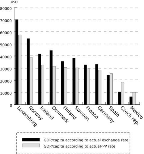 | Keywords: Pppgdp vers gdp in oecd en.svg Statistics from OECD 2004 These countries' GDP per capita measured in american dollars differ depending on the method of recalculating domestic currencies to dollars Every country is shown with its PPP-ajusted exchange rate as well as the market exchange rates for 2004 Created using data from OECD ISBN 9264013059 www oecd org statistics national accounts Downloadable in exel format at http //dx doi org/10 1787/546114387831 Own 1 Jan 2005 Josef Lilljegren Josef lilljegren GDP bar charts |