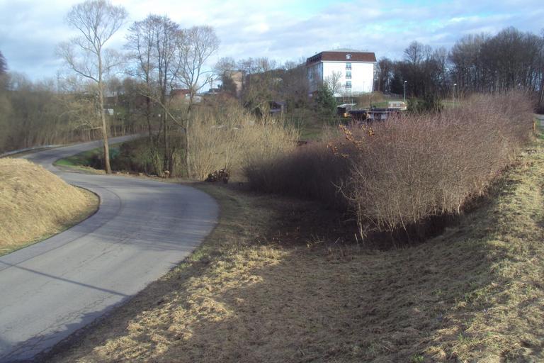 Keywords: Před Novými Zákupy.JPG cs Pohled z cesty po náspu zrušené vlečky na jižní okraj Nových Zákup bílá budova Domova důchodců před ni malá zahrádkářská kolonie own Zákupák 2015-01-14 Nové Zákupy