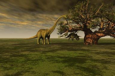 Keywords: prehistoric history extinct brontosaurus dinosaur animal long neck tail triceratops tree landscape sky clouds ancient grass leaves