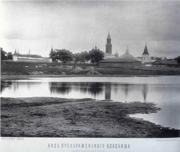 Keywords: Preobrazhenskoye Cemetery 1886.jpg Preobrazhenskoye Cemetery across Khapilovsky Pond in Moscow Russia in 1886 A photo from N A Naidyonov's album printed in the 19th century П еоб аженское кладбище че ез Хапиловский п уд в оскве в 1886 году Фотог афия из альбома А айдёнова изданного в XIX веке Moskovskaya starina A photoalbum Moscow Planeta 1995 P 204 ISBN 5-85250-139-5 осковская ста ина Фотоальбом Планета 1995 С 204 ISBN 5-85250-139-5 Originally published in 1888 as plate 24 of А айдёнов осква Виды некото ых го одских местностей х амов п имечательных зданий и д угих соо ужений П иложений 1-е 1888 Изд Кушне ёва фототипия Ше е абгольц и Ко Photographed in 1886 Nikolay Naidenov 1834-1905 <br>Scanned and processed by Leonid Dzhepko thumb leftthumb left PD-old Historical images of Preobrazhenskoe Preobrazhenskoye Cemetery Views of Moscow by Nikolay Naidenov 1888 supplement 24a Scherer and Nabholz |