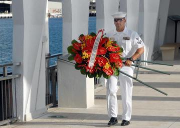 Keywords: Preparing a wreath at Pearl Harbor DVIDS134827.jpg en Petty Officer 2nd Class Arthur Sacdana prepares a wreath donated by the Consulate General of Japan for display during upcoming Pearl Harbor Day events aboard the USS Arizona Memorial The wreaths serve as a tribute to service members killed during the Dec 7 1941 attack on Pearl Harbor The theme of this year's historic commemoration Pacific War Memories The Heroic Response to Pearl Harbor emphasized the brave efforts of those who fought at sea on land and in the air to turn the tide in the Pacific More than 2 000 guests and the general public joined service members Pearl Harbor survivors and their families and friends for the annual observance 2008-12-06 Petty Officer 2nd Class Jeremy S Brandt https //www dvidshub net/image/134827 081206-N-+++++-182 2008-12-09 23 21 PEARL HARBOR HI US PD-USGov-Military-Navy USS Arizona Memorial interior Images from DoD uploaded by Fæ |