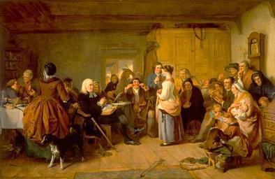 Keywords: Presbyterian Catechising.jpg en This painting shows the minister of the local kirk questioning a young parish girl about particular aspects of her Protestant faith This practice which was used as an instructive teaching method was known as catechising Stylistically it is reminiscent of Scottish village scenes by David Wilkie but Phillips ™s treatment is more sentimental even nostalgic; the costumes are those of the previous century An unusual feature in the design is the presence of the hearthstone in the extreme bottom foreground that indicates that the spectator is standing somewhere in or even beyond the fireplace Details Acc No NG 1155 Medium Oil on canvas Size 100 60 x 156 00 cm framed 125 50 x 178 00 x 6 50 cm Credit Bequest of John Jordan 1914 1847 http //www bbc co uk/arts/yourpaintings/paintings/presbyterian-catechising-210521 Creator John Phillip PD-art-100-1923 Uploaded with UploadWizard Presbyterianism John Phillip Images from BBC Your Paintings Examinations in art |