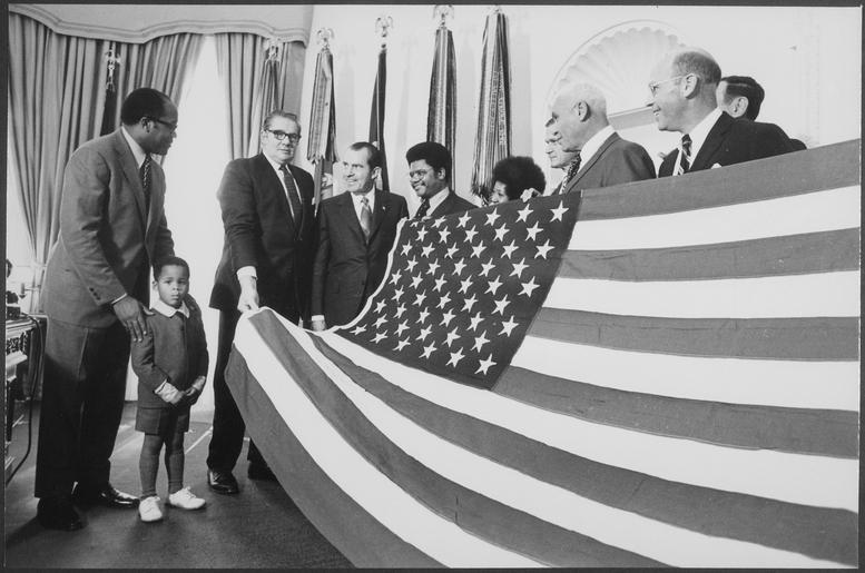 | Keywords: Presentation of American Flag - NARA - 194701.tif Scope and content Pictured Watts Manufacturing Group Subject Presentations General notes 194701 Local identifier NLRN-WHPO-5234-07 General Services Administration National Archives and Records Service Office of Presidential Libraries Office of Presidential Papers 01/20/1969 - ca 12/1974 Most Recent <br /> President 1969-1974 Nixon White House Photo Office 1969 - 1974 Most Recent Richard Nixon Library NLRN 18001 Yorba Linda Boulevard Yorba Linda CA 92886 1970-12-08 Record group Collection RN-WHPO White House Photo Office Collection Nixon Administration 01/20/1969 - 08/09/1974 Record group ARC 1179 Nixon White House Photographs compiled 01/20/1969 - 08/09/1974 documenting the period 08/08/1968 - 08/09/1974 Series ARC 194277 File unit File unit ARC Variant control numbers NAIL Control Number NLNP-WHPO-MPF-5234 07 yes Other versions NARA-cooperation PD-USGov Photographs of flags of the United States 1970 in the United States Richard Nixon in 1970 Richard Nixon with people |