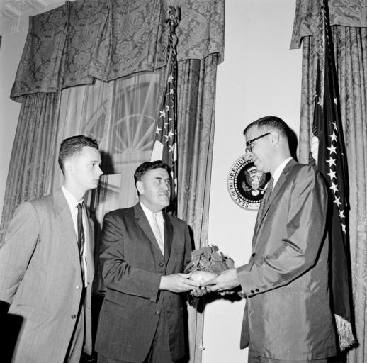 Keywords: u.s. national archives usnationalarchives jfk presidential library jfkpresidentiallibrary blackandwhite monochrome black and white Original Caption: Presentation of a Plant for President John F. Kennedy We are looking for your help in identifying unknown people in our White House Photographs collection. If you have any information about this photograph, please post a comment, including any relevant sources, for the catalogers at the John F. Kennedy Presidential Library. Thank you! Local Identifier: JFKWHP-ST-175-1-61 Created By: Cecil Stoughton's White House Photographs, 01/29/1961 - 12/31/1963 From: President (1963-1969 : Johnson). White House Photograph Office. (1963 - 1969) Contact: John F. Kennedy Library (LP-JFK), Columbia Point Boston, MA 02125-3398 Phone: 617-514-1600 Fax: 617-514-1652 Email: kennedy.library@nara.gov Production Dates: 8/5/1961 Scope and Content Note: In this photograph an unidentified White House staff member accepts a gift of a plant for President John F. Kennedy from two unidentified visitors in the Oval Office, White House, Washington, D.C. Persistent URL: JFK Library URL: www.jfklibrary.org/Asset-Viewer/Archives/JFKWHP-ST-175-1-... Access Restrictions: Unrestricted Use Restrictions: Unrestricted Original Caption: Presentation of a Plant for President John F. Kennedy We are looking for your help in identifying unknown people in our White House Photographs collection. If you have any information about this photograph, please post a comment, including any relevant sources, for the catalogers at the John F. Kennedy Presidential Library. Thank you! Local Identifier: JFKWHP-ST-175-1-61 Created By: Cecil Stoughton's White House Photographs, 01/29/1961 - 12/31/1963 From: President (1963-1969 : Johnson). White House Photograph Office. (1963 - 1969) Contact: John F. Kennedy Library (LP-JFK), Columbia Point Boston, MA 02125-3398 Phone: 617-514-1600 Fax: 617-514-1652 Email: kennedy.library@nara.gov Production Dates: 8/5/1961 Scope and Content Note: In this photograph an unidentified White House staff member accepts a gift of a plant for President John F. Kennedy from two unidentified visitors in the Oval Office, White House, Washington, D.C. Persistent URL: JFK Library URL: www.jfklibrary.org/Asset-Viewer/Archives/JFKWHP-ST-175-1-... Access Restrictions: Unrestricted Use Restrictions: Unrestricted |
