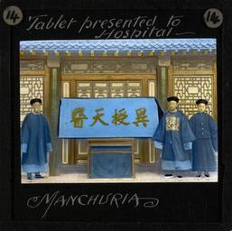 Keywords: Presentation of a Tablet to a Hospital, Manchuria, ca. 1882-ca. 1936 (imp-cswc-GB-237-CSWC47-LS8-014).jpg en <br> Presentation of a Tablet to a Hospital Manchuria ca 1882-ca 1936 Tablet Presented to Hospital Manchuriaa Photograph of a tablet that was presented to a hospital in Manchuria The tablet displays 4 Chinese characters There are three Chinese men in the photograph all wearing traditional blue Chinese robes ; This belongs to a series of Church of Scotland Foreign Missions Committee lantern slides relating to the Scottish missionary Dugald Christie Dugald Christie was born in Glencoe in Scotland and studied medicine under the auspices of the Edinburgh Medical Missionary Society In 1882 along with his first wife Elizabeth he went to Manchuria to work as a medical missionary of the United Presbyterian Church of Scotland He worked initially in Newchang and later moved to the capital of Mukden where he opened Manchuriaas first hospital in 1884 In 1912 he established Mukden Medical College Dugald Christie retired in 1923 and died in Edinburgh in 1936 Photographer Unknown Filename imp-cswc-GB-237-CSWC47-LS8-014 tif Coverage date 1882/1936 Part of collection International Mission Photography Archive ca 1860-ca 1960 Geographic subject region Manchuria Type images Part of subcollection Photographs from the Centre for the Study of World Christianity University of Edinburgh U K ca 1900-ca 1940s Repository name Centre for the Study of World Christianity Archival file impaunpub_Volume7/1678 url Repository address The University of Edinburgh School of Divinity New College Mound Place Edinburgh EH1 2LX United Kingdom Geographic subject country China Format aacr2 1 lantern slide 8 x 8 cm Geographic subject continent Asia Rights Contact the repository for details Part of series Dugald Christie LS8 Repository email divinity-CSWC ed ac uk Subject lcsh Keyword Hospitals; Rites and ceremonies Date created 1882/1936 Publisher of the digital version University of Southern California Libraries Subject aat genre group portraits Format aat lantern slides Legacy record ID impa-m69105 Access conditions http //www ed ac uk/schools-departments/divinity/research/centres/world-christianity/collections-resources File GB 237 CSWC47/LS8/14 1882/1936 author http //digitallibrary usc edu/cdm/ref/collection/p15799coll123/id/64797 PD-old-70-1923 Magic lantern images Images from USC Digital Library uploaded by Fæ International Mission Photography Archive ca 1860-ca 1960 |
