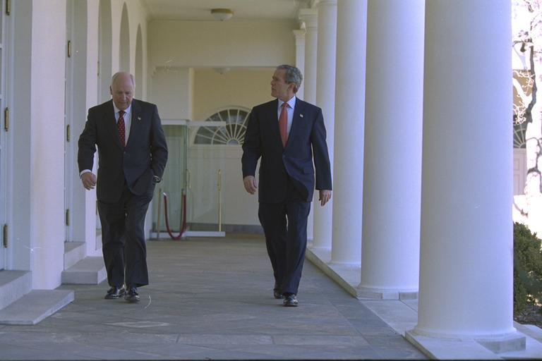 View Original:President_Bush_and_Vice_President_Cheney_Walk_Along_the_White_House_Colonnade.jpg (3072x2048)