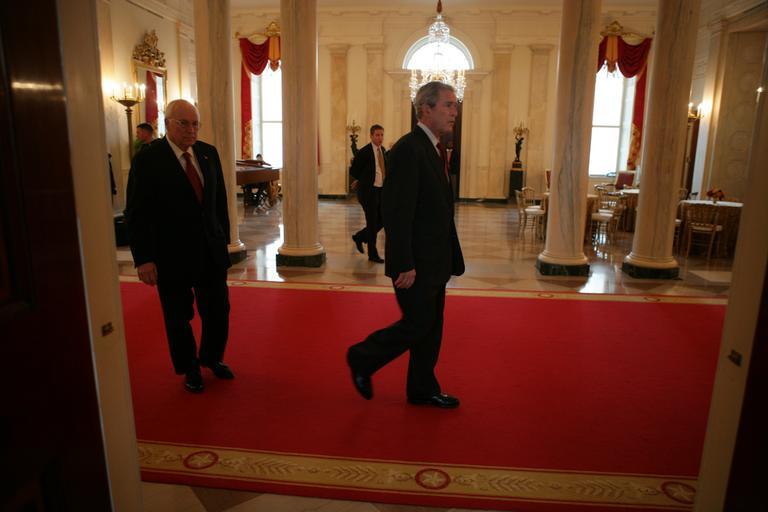 View Original:President_Bush_and_Vice_President_Cheney_Walk_Together_on_the_White_House_State_Floor.jpg (4992x3328)