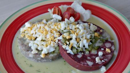 Keywords: pressack sausage sour snack onion cucumber egg mustard eat food tasty