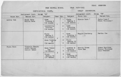 | Keywords: Prevocational chart, girls' industries, Fort Bidwell School. - NARA - 296109.jpg Scope and content This document illustrate aspects of Federal policy towards Native Americans and its execution with regard to Native American education during the early twentieth century preceding passage of the Indian Reorganization Act General notes 296109 Local identifier Department of the Interior Office of Indian Affairs Fort Bidwell School and Agency 1898 - 1936 NARA's Pacific Region San Bruno NRHAS 1000 Commodore Drive San Bruno CA 94066-2350 1922 Record group Record Group 75 Records of the Bureau of Indian Affairs 1793 - 1999 Record group ARC 404 Records of Fort Bidwell School Calendar and Programs compiled 1910 - 1929 Series ARC 296103 File unit Calendars and Programs 1910 - 1929 File unit ARC 296104 Variant control numbers NAIL Control Number NRHS-75-BIDWLENT18-CALENDARS-5 Other versions <gallery> File Prevocational_chart _girls'_industries _Fort_Bidwell_School _-_NARA_-_296109 tif tif File Prevocational_chart _girls'_industries _Fort_Bidwell_School _-_NARA_-_296109 jpg jpg </gallery> NARA-cooperation PD-USGov Fort Bidwell Indians Native American schools Education in California 1922 in California |