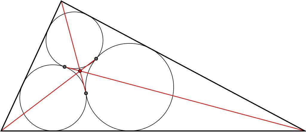 Keywords: Primo punto di Malfatti.svg il punto di intersezione dei segmenti che collegano i vertici dei triangolo ai punti opposti di tangenza fra i it cerchi di Malfatti Own 2008-02-22 Personline Malfatti circles