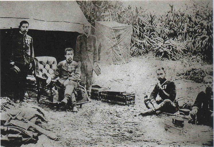 Keywords: Prince Kitashirakawa Yoshihisa in Gongliao.jpg ja 日 の皇族であった北白 宮能久が台湾の澳底に上陸して野営している様子を撮影したもの 図説台湾の歴史 平凡社 2007年 94頁より転載 もともとの写 は1935年刊行の 北白 宮能久親王御遺跡 に掲載されていた 大日 国軍? 1894 Prince Kitashirakawa Yoshihisa Gongliao District New Taipei PD-Japan-oldphoto |