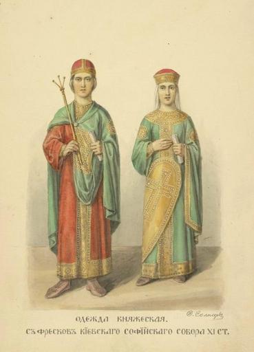 | Keywords: Princely Clothes from Kievan frescoes.jpg ru Княжеские одеяния С ф есок Киевского собо а XI век en Princely Clothes From frescos in Sofia's cathedral in Kiev XI century 1590663 Рисунки сделаны Федо ом Солнцевым с ф есок в се едине XIX века когда их отк ыли из-под ста ых наслоений п ежде чем их от естав и овали а точнее на исовали вновь Степень точности восп оизведения ф есок Солцевым ставилась под сомнение возможно в деталях одежды п исутствуют вновь созданные элементы Fashion of Russia 1050 about 11th-century fashion Russia Saint Sophia Cathedral frescos |