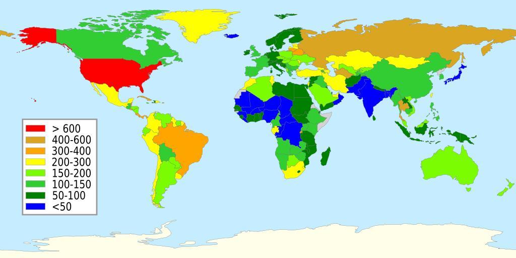 | Keywords: Prisoner population rate world map.svg red >600 goldenrod 400-600 orange 300-400 yellow 200-300 lawngreen 150-200 limegreen 100-150 green 50-100 blue <50 lightgray no data File World location map svg Delphi234 2015-01-31 Data fromhttp //www prisonstudies org/highest-to-lowest/prison_population_rate field_region_taxonomy_tid All wikitable sortable Country Prisoners Rate Year - Afghanistan 26 519 74 2014 - Albania 5 734 198 2014 - Algeria 60 220 162 2013 - Angola 21 634 105 2013 - Argentina 64 288 154 2013 - Armenia 3 923 132 2014 - Australia 35 804 151 2015 - Austria 8 241 96 2014 - Azerbaijan 22 526 236 2014 - Bangladesh 69 719 43 2015 - Belarus 29 000 306 2014 - Belgium 11 769 105 2014 - Belize 1 545 449 2015 - Benin 7 247 77 2012 - Bhutan 1 084 143 2013 - Bolivia 14 587 134 2014 - Bosnia and Herzegovina Federation 1 883 80 2013 - Botswana 3 826 188 2013 - Brazil 607 731 301 2014 - Brunei Darussalam 594 129 2014 - Bulgaria 9 028 125 2014 - Burkina Faso 6 251 34 2014 - Burma Myanmar 60 000 113 2013 - Burundi 8 646 93 2014 - Cambodia 16 497 105 2015 - Cameroon 25 337 115 2012 - Canada 37 864 106 2014 - Central African Republic 845 19 2011 - Chad 4 831 39 2011 - Chile 42 829 240 2015 - China 1 657 812 119 2014 - Colombia 120 905 244 2015 - Congo Brazzaville 1 240 27 2014 - Costa Rica 17 440 352 2014 - Croatia 3 853 91 2014 - Cuba 57 337 510 2012 - Cyprus Republic of 811 94 2013 - Czech Republic 20 304 192 2015 - Democratic Republic of Congo formerly Zaire 22 000 35 2010 - Denmark 3 481 61 2015 - Djibouti 600 68 2014 - Dominican Republic 24 832 233 2015 - Ecuador 25 902 162 2014 - Egypt 62 000 76 2013 - El Salvador 29 925 465 2015 - England Wales United Kingdom 86 179 148 2015 - Equatorial Guinea 1 000 132 2013 - Eritrea - Estonia 2 862 218 2015 - Ethiopia 93 044 111 2011 - Finland 3 105 57 2015 - France 66 864 100 2015 - French Guiana/Guyane France 726 277 2015 - Gabon 3 500 210 2013 - Gambia 914 48 2014 - Georgia 10 493 281 2015 - Germany 63 628 78 2015 - Ghana 14 297 53 2015 - Greece 11 988 111 2014 - Greenland Denmark 116 208 2015 - Guatemala 19 021 117 2015 - Guinea Republic of Guinea 2 600 22 2013 - Guinea Bissau 92 2013 - Guyana 1 998 264 2013 - Haiti 10 266 97 2015 - Honduras 16 331 196 2014 - Hungary 17 716 180 2015 - Iceland 147 45 2014 - India 411 992 33 2013 - Indonesia 161 692 64 2014 - Iran 225 624 290 2014 - Iraq 45 634 133 2013 - Ireland Republic of 3 791 82 2015 - Israel 18 658 240 2013 - Italy 52 144 86 2015 - Ivory Coast Cote d'Ivoire 10 850 52 2014 - Jamaica 4 050 145 2014 - Japan 61 794 49 2014 - Jordan 10 089 150 2014 - Kazakhstan 47 939 275 2015 - Kenya 54 154 119 2015 - Kuwait 2 900 86 2013 - Kyrgyzstan 10 060 182 2013 - Laos 4 020 71 2004 - Latvia 4 745 239 2014 - Lebanon 6 012 120 2014 - Lesotho 2 073 92 2014 - Liberia 1 719 39 2014 - Libya 6 187 99 2014 - Lithuania 8 848 302 2014 - Luxembourg 631 112 2015 - Macedonia former Yugoslav Republic of 3 034 147 2014 - Madagascar 18 719 83 2013 - Malawi 12 156 72 2014 - Malaysia 49 200 161 2015 - Mali 4 963 33 2013 - Mauritania 1 768 44 2014 - Mexico 255 138 212 2015 - Moldova Republic of 7 643 215 2015 - Mongolia 7 773 264 2014 - Montenegro 1 083 174 2014 - Morocco 76 000 227 2015 - Mozambique 15 663 62 2013 - Namibia 3 560 144 2015 - Nepal 16 813 52 2014 - Netherlands 12 638 75 2013 - New Zealand 8 641 190 2014 - Nicaragua 9 800 160 2013 - Niger 7 116 40 2013 - Nigeria 57 121 32 2014 - North Korea - Northern Ireland United Kingdom 1 666 90 2015 - Norway 3 710 71 2015 - Oman 1 300 36 2013 - Pakistan 80 169 43 2015 - Panama 15 508 392 2015 - Papua New Guinea 4 580 61 2014 - Paraguay 10 949 158 2014 - Peru 73 255 236 2015 - Philippines 120 076 120 2014 - Poland 75 691 199 2015 - Portugal 14 293 138 2015 - Puerto Rico USA 12 551 351 2013 - Qatar 1 150 53 2013 - Romania 29 312 148 2015 - Russian Federation 649 500 450 2015 - Rwanda 55 618 492 2012 - Saudi Arabia 47 000 161 2013 - Scotland United Kingdom 7 760 145 2015 - Senegal 8 630 62 2014 - Serbia 10 031 140 2013 - Sierra Leone 3 792 61 2014 - Slovakia 10 141 187 2015 - Slovenia 1 511 73 2015 - Somalia 3 450 2012 - South Africa 159 241 292 2015 - South Korea Republic of Korea 50 800 104 2014 - South Sudan 7 500 65 2013 - Spain 64 835 140 2015 - Sri Lanka 19 774 92 2014 - Sudan 19 101 50 2013 - Suriname 1 000 183 2014 - Swaziland 3 616 289 2014 - Sweden 5 779 60 2014 - Switzerland 6 923 84 2014 - Syria 10 599 60 2004 - Taiwan 63 108 269 2015 - Tajikistan 9 317 121 2010 - Tanzania 34 196 69 2014 - Thailand 308 111 457 2015 - Togo 4 493 64 2014 - Trinidad and Tobago 3 481 259 2014 - Tunisia 23 686 212 2014 - Turkey 165 033 212 2015 - Turkmenistan 30 568 583 2013 - Uganda 42 013 110 2015 - Ukraine 71 325 195 2015 - United Arab Emirates 11 193 229 2006 - United States 2 217 000 698 2013 - Uruguay 9 632 282 2014 - Uzbekistan 46 200 160 2013 - Venezuela 55 007 178 2014 - Vietnam 142 636 154 2014 - Western Sahara - Yemen 14 000 53 2013 - Zambia 17 160 118 2014 - Zimbabwe 18 857 145 2015 Not shown on map wikitable sortable Country Prisoners Rate Year - American Samoa USA 192 349 2012 - Andorra 55 72 2014 - Anguilla United Kingdom 57 407 2014 - Antigua and Barbuda 331 355 2014 - Aruba Netherlands 170 165 2014 - Bahamas 1 396 363 2014 - Bahrain 4 028 301 2013 - Barbados 884 309 2014 - Bermuda United Kingdom 230 354 2014 - Bosnia and Herzegovina Republika Srpska 940 71 2014 - Cape Verde Cabo Verde 1 434 286 2013 - Cayman Islands United Kingdom 190 344 2014 - Comoros 233 31 2014 - Cook Islands New Zealand 25 109 2011 - CuraƧao Netherlands 348 225 2014 - Dominica 238 350 2013 - Faeroe Islands Denmark 9 19 2013 - Fiji 1 520 171 2014 - French Polynesia France 451 159 2012 - Gibraltar United Kingdom 48 146 2013 - Grenada 456 430 2013 - Guadeloupe France 913 192 2015 - Guam USA 797 469 2015 - Guernsey United Kingdom 96 148 2014 - Hong Kong China 8 284 114 2015 - Isle of Man United Kingdom 86 99 2015 - Jersey United Kingdom 133 132 2014 - Kiribati 120 115 2014 - Kosovo/Kosova 1