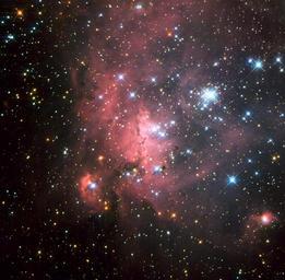| Keywords: lh 72 lh72 lmc4 texture In one of the largest known star formation regions in the Large Magellanic Cloud (LMC), a small satellite galaxy of the Milky Way, lie young and bright stellar groupings known as OB associations. One of these associations, called LH 72, was captured in this dramatic NASA/ESA Hubble Space Telescope image. It consists of a few high-mass, young stars embedded in a beautiful and dense nebula of hydrogen gas. Much of the star formation in the LMC occurs in super-giant shells. These regions of interstellar gas are thought to have formed due to strong stellar winds and supernova explosions that cleared away much of the material around the stars creating wind-blown shells. The swept-up gas eventually cools down and fragments into smaller clouds that dot the edges of these regions and eventually collapse to form new stars. The biggest of these shells, home to LH 72, is designated LMC4. With a diameter of about 6000 light-years, it is the largest in the Local Group of galaxies that is home to both the Milky Way and LMC. Studying gas-embedded young associations of stars like LH 72 is a way of probing the super-giant shells to understand how they formed and evolved. This image was taken with Hubble’s Wide Field Planetary Camera 2 using five different filters in ultraviolet, visible and infrared light. The field of view is approximately 1.8 by 1.8 arcminutes. In one of the largest known star formation regions in the Large Magellanic Cloud (LMC), a small satellite galaxy of the Milky Way, lie young and bright stellar groupings known as OB associations. One of these associations, called LH 72, was captured in this dramatic NASA/ESA Hubble Space Telescope image. It consists of a few high-mass, young stars embedded in a beautiful and dense nebula of hydrogen gas. Much of the star formation in the LMC occurs in super-giant shells. These regions of interstellar gas are thought to have formed due to strong stellar winds and supernova explosions that cleared away much of the material around the stars creating wind-blown shells. The swept-up gas eventually cools down and fragments into smaller clouds that dot the edges of these regions and eventually collapse to form new stars. The biggest of these shells, home to LH 72, is designated LMC4. With a diameter of about 6000 light-years, it is the largest in the Local Group of galaxies that is home to both the Milky Way and LMC. Studying gas-embedded young associations of stars like LH 72 is a way of probing the super-giant shells to understand how they formed and evolved. This image was taken with Hubble’s Wide Field Planetary Camera 2 using five different filters in ultraviolet, visible and infrared light. The field of view is approximately 1.8 by 1.8 arcminutes. |