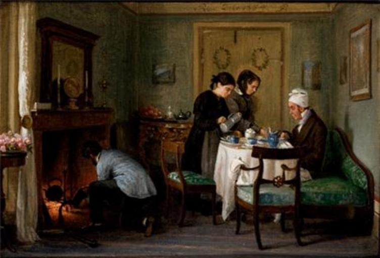 | Keywords: Professor N.L. Høyen skal i audiens hos Paven.jpg  Artwork creator P C Skovgaard From left to right P C Skovgaard knealing by the fireplace Georgia Skovgaard Edele Birgitte Høyen and N L Høyen 1854 Oil on canvas 20 5 x 29 8 cm Skovgaard Museet object history exhibition history credit line accession number 10 169 http //www skovgaardmuseet dk/samlinger/info-om-nl-hoeyen-skal-i-audiens-hos-paven aspx PD-old-100 1854 paintings P C Skovgaard Georgia Skovgaard 1828-1868 Niels Laurits Høyen Skovgaard Museet |