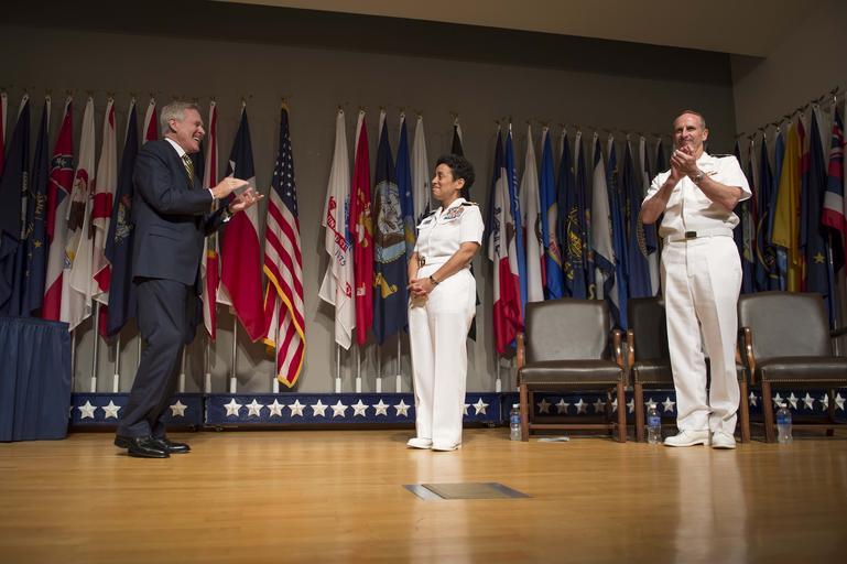 | Keywords: Promotion ceremony 140701-N-WL435-270.jpg en Secretary of the Navy Ray Mabus and Chief of Naval Operations CNO Adm Jonathan Greenert applaud Adm Michelle Howard on her promotion to the rank of admiral Tuesday July 1 2014 at the Women in Military Service for America Memorial Howard is the first woman to be promoted to the rank of admiral in the history of the Navy and will assume the duties and responsibilities as the 38th Vice Chief of Naval Operations from Adm Mark Ferguson U S Navy photo by Chief Mass Communication Specialist Peter D Lawlor/Released 2014-07-01 Petty Officer 1st Class Peter Lawlor https //www dvidshub net/image/1430989 140701-N-WL435-270 2014-07-01 22 52 WASHINGTON DC US PD-USGov-Military-Navy Mark E Ferguson III Ray Mabus Jonathan W Greenert in 2014 Images from DoD uploaded by Fæ |