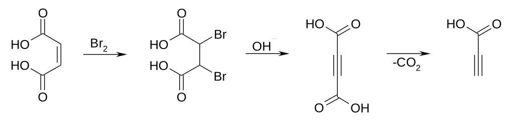 Keywords: Propiolic acid synthesis 01.svg en Synthesis of propiolic acid de Synthese von Propiolsäure Acetylencarbonsäure own Steffen 962 2010-09-18 Organic synthesis
